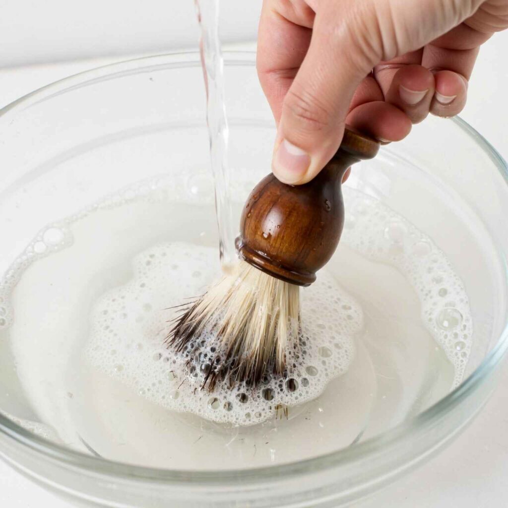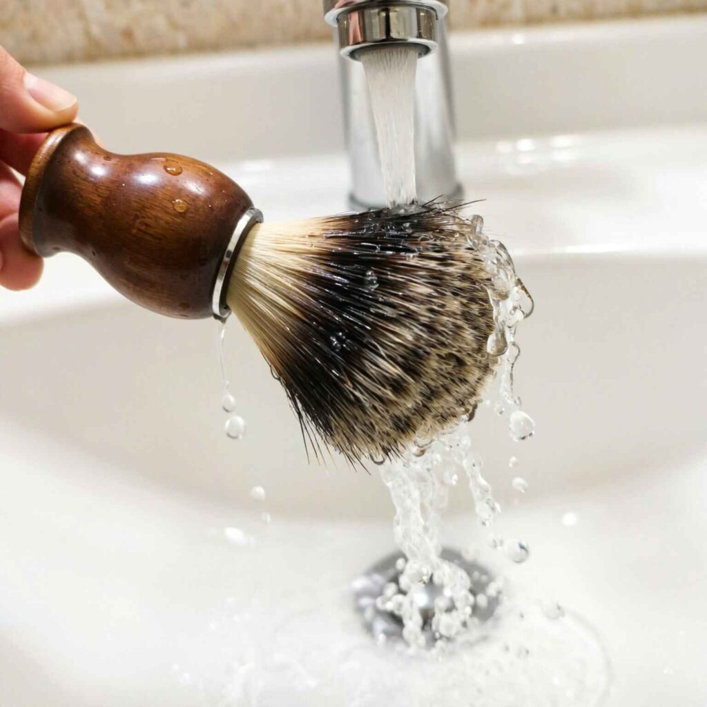 Start by rinsing the brush under warm (not hot) water for 30–40 seconds. This loosens any leftover shaving cream or soap.