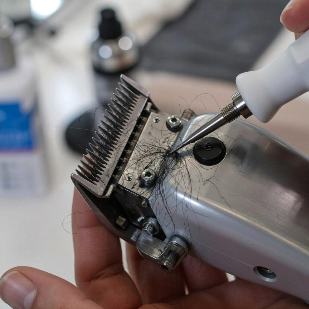 Remove the blade guard and use a small brush or compressed air to clean trapped hair and debris. Apply a few drops of blade wash or rubbing alcohol to disinfect, then dry the blades before applying clipper oil. Cleaning your clippers regularly prevents pulling, overheating, and extends their lifespan.